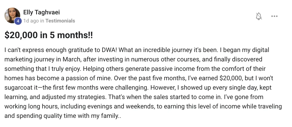 DWA is a comprehensive marketing course designed for beginners (even with no experience) to learn how to launch a successful digital marketing business.